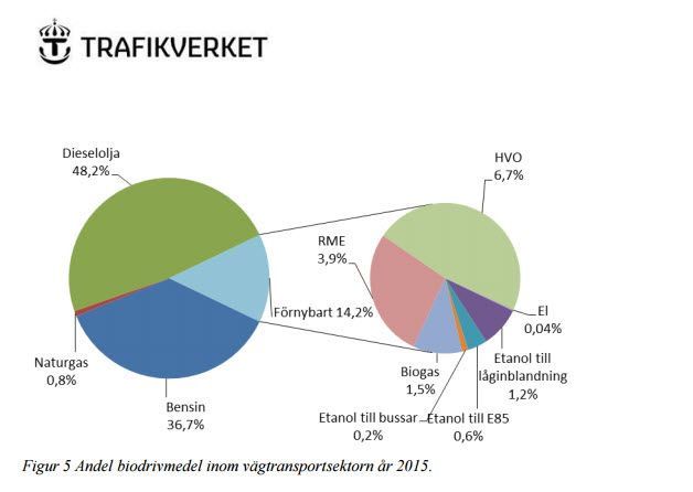 Nedan visas hur användningen av olika drivmedel såg ut inom transportsektorn år 2015 och 2016 enligt Trafikverket. Av de förnybara biodrivmedlen är HVO störst (kring 12 %), sen kommer RME (kring 3 %), sen ligger biogas och etanol mellan 1 och 2 % vardera. Andelen fordonsgas är på oförändrad nivå mellan år 2015 och 2016, däremot har andelen biogas ökat något från 74 % till 75 % (källa) (Svebios syn på hur förändringar rörande drivmedel mellan 2015 och 2016 inom transportsektorn presenteras):